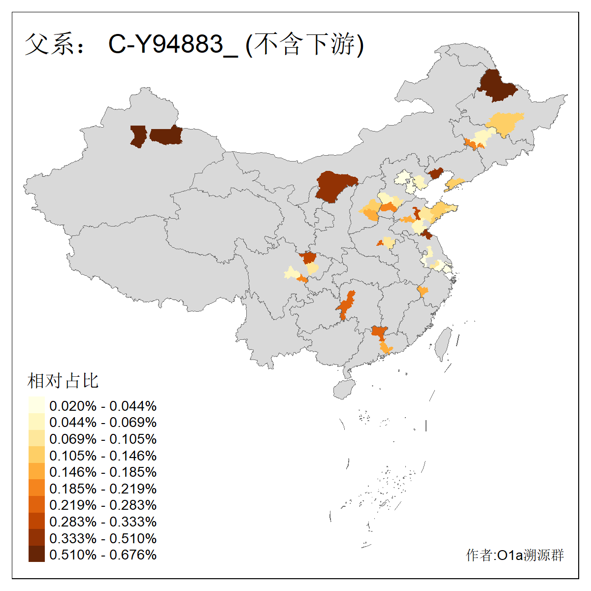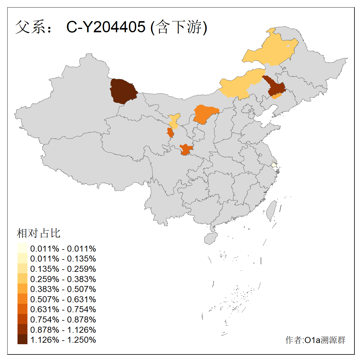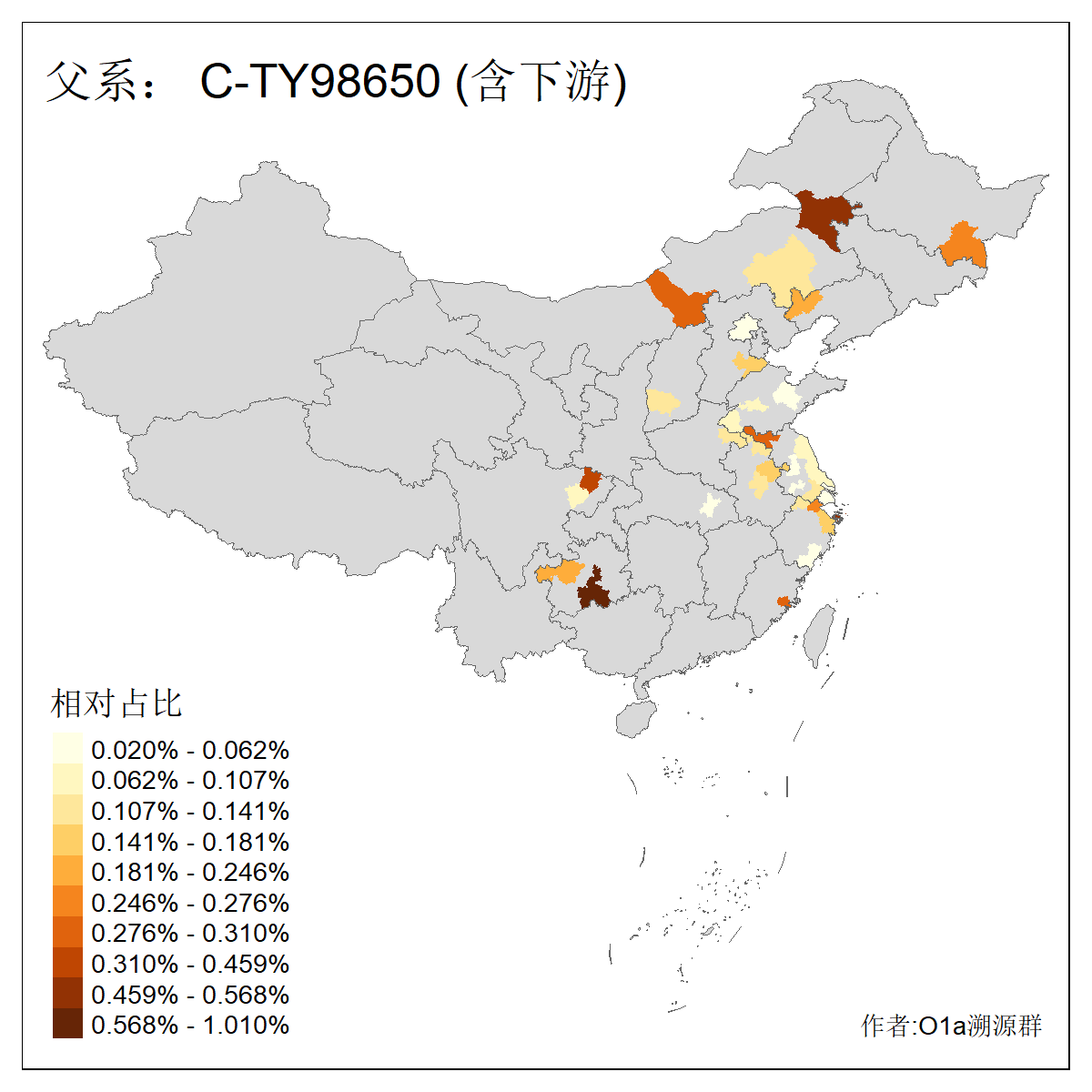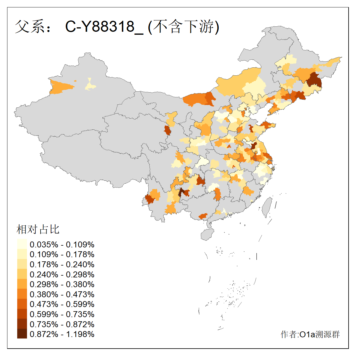| C-M130_C-M217_C-L1373_C-F3447_C-F1699_C-Y6715_C-M48_C-M86_C-SK1061_C-B469 | 2160 | 0.041% | 116人(含下游) 吴:13 白:9 何:5 张:5 包:4 李:4 阿:4 陶:4 付:3 关:3 赵:3 乌:2 卜:2 叶:2 ![]() | 14人(不含下游) 孙:2 白:2 代:1 全:1 凯:1 吴:1 张:1 李:1 赵:1 陈:1 额:1 高:1 ![]() |