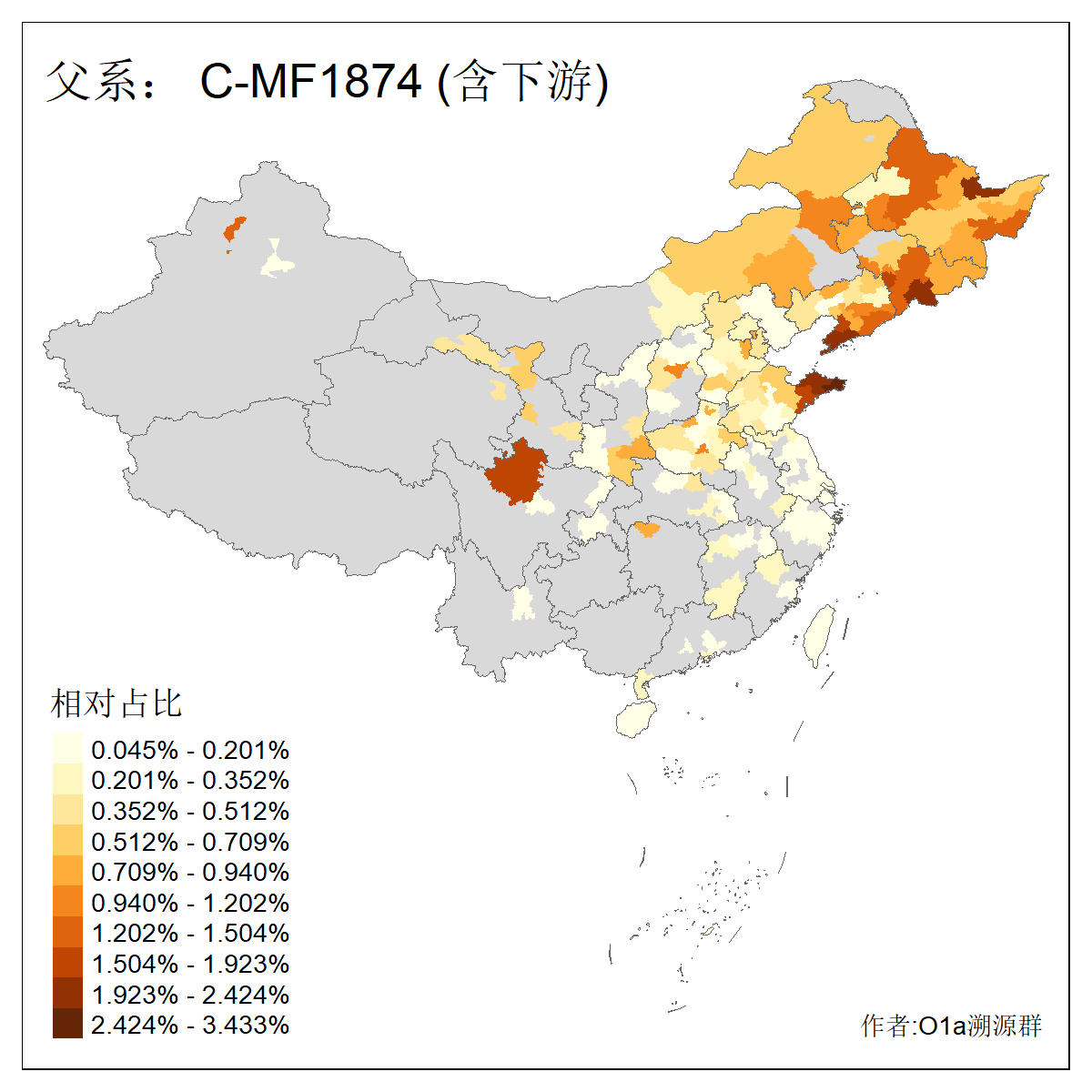 | C-M130_C-M217_C-L1373_C-F3447_C-F1699_C-Y6715_C-Y10418_C-FGC28903_C-F1756_C-F12632_C-Y10417_C-F3830 | 4820 | 0.440% | 1079人(含下游) 王:91 刘:85 张:77 李:77 赵:36 关:29 杨:25 马:24 高:19 吴:18 白:18 陈:17 孙:16 田:12 ![]() | 149人(不含下游) 李:16 张:13 刘:10 王:7 吴:5 翟:5 孙:4 于:3 白:3 陈:3 乔:2 何:2 姚:2 孟:2 ![]() |