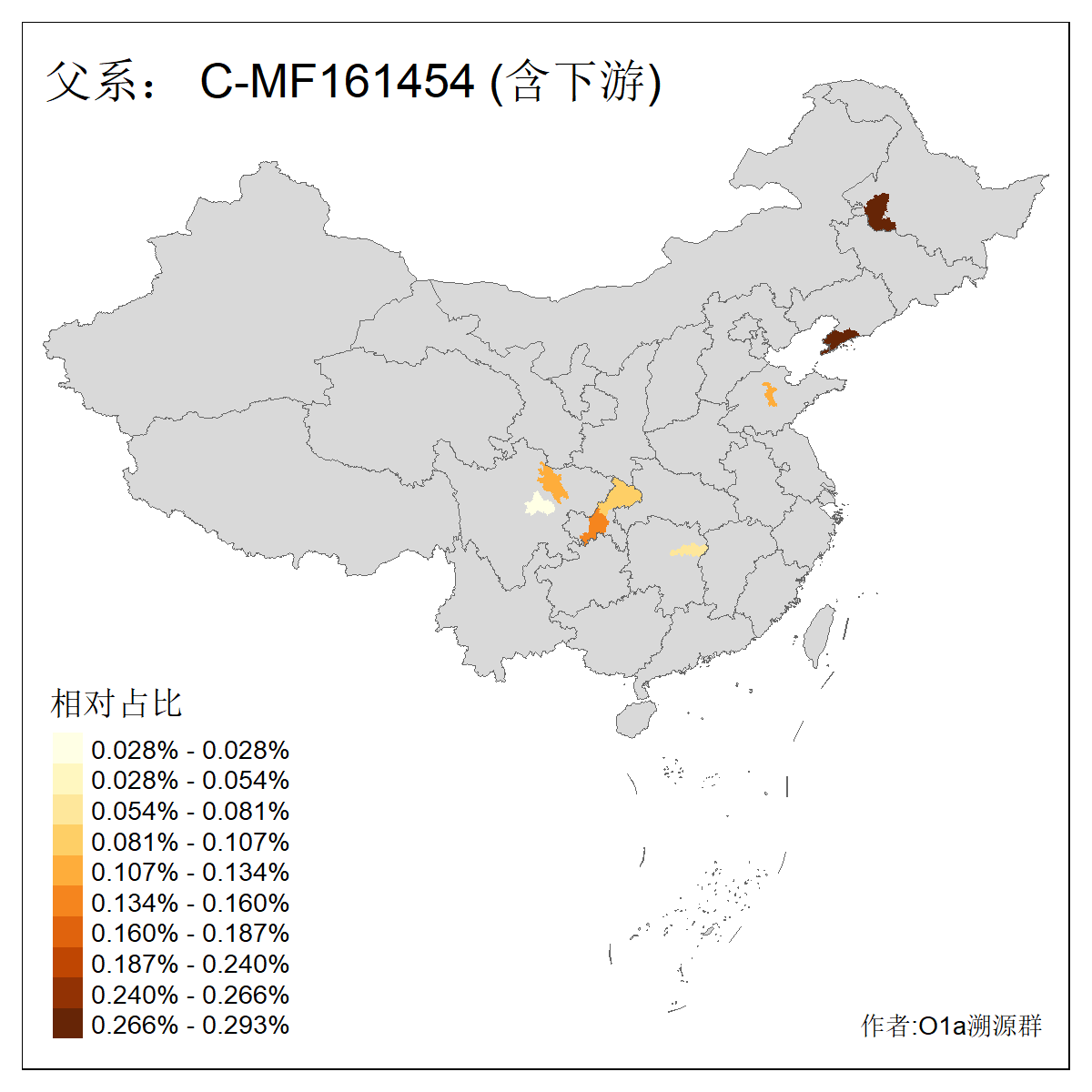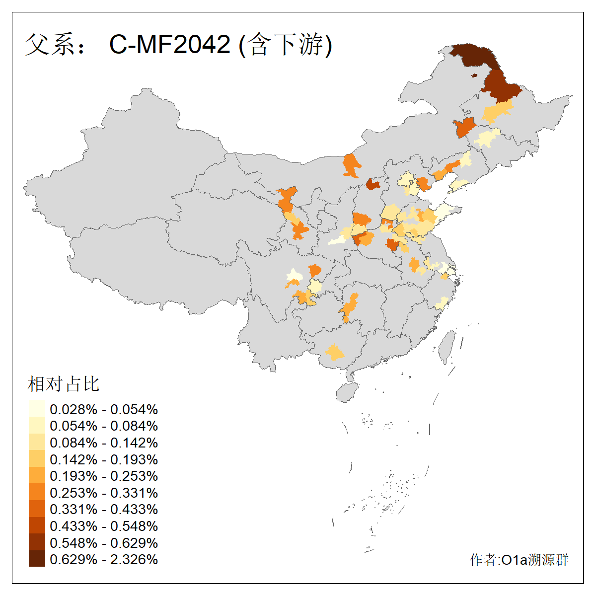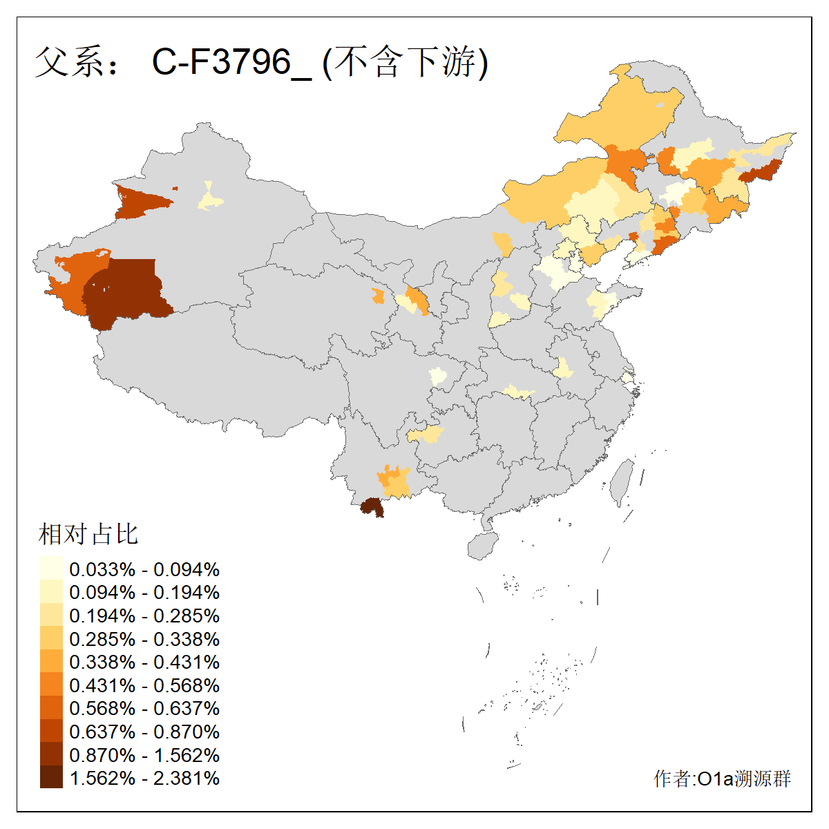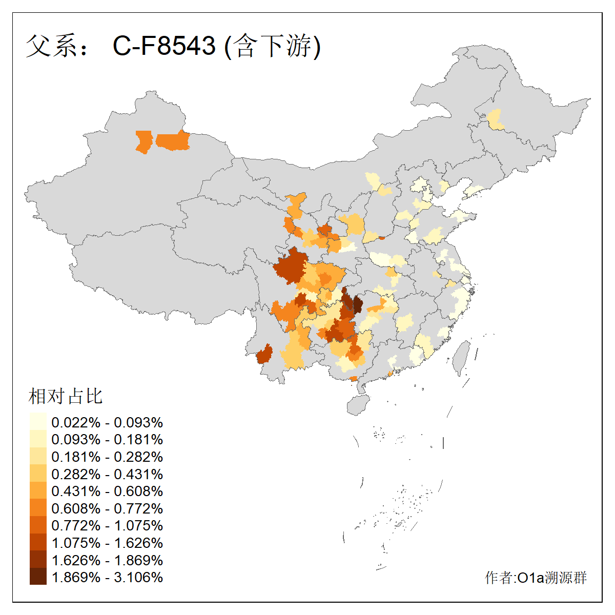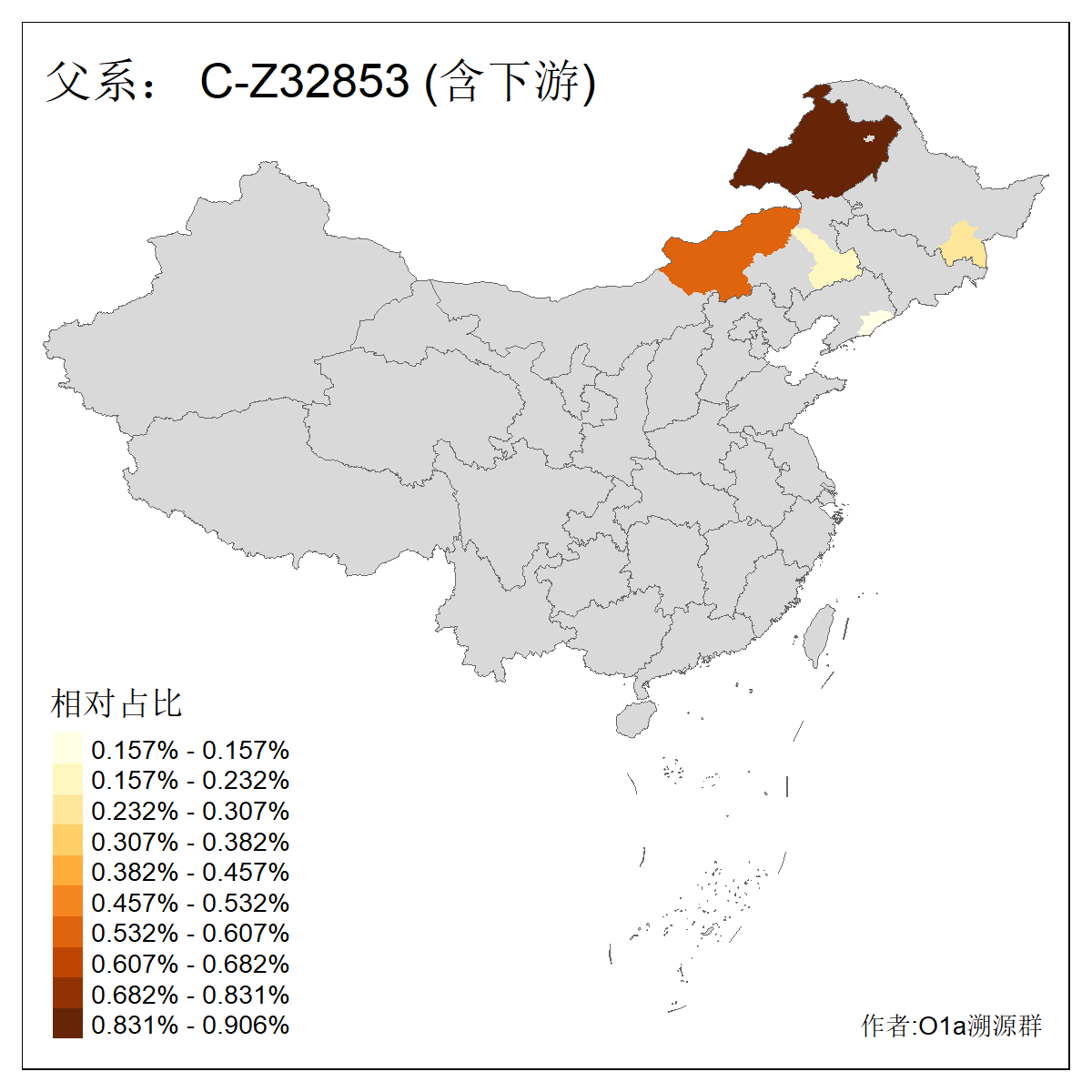 | C-M130_C-M217_C-L1373_C-F3447_C-F1699_C-Y6715_C-M504_C-Y4519_C-Y11121_C-F3796 | 2810 | 0.276% | 553人(含下游) 关:27 李:27 张:21 吴:19 王:18 阿:16 艾:14 赵:14 刘:12 巴:12 何:11 哈:11 包:10 白:10 ![]() | 101人(不含下游) 刘:8 李:8 吴:6 赵:6 张:5 王:5 赫:5 南:4 柴:4 火:3 郭:3 何:2 佟:2 傅:2 ![]() |