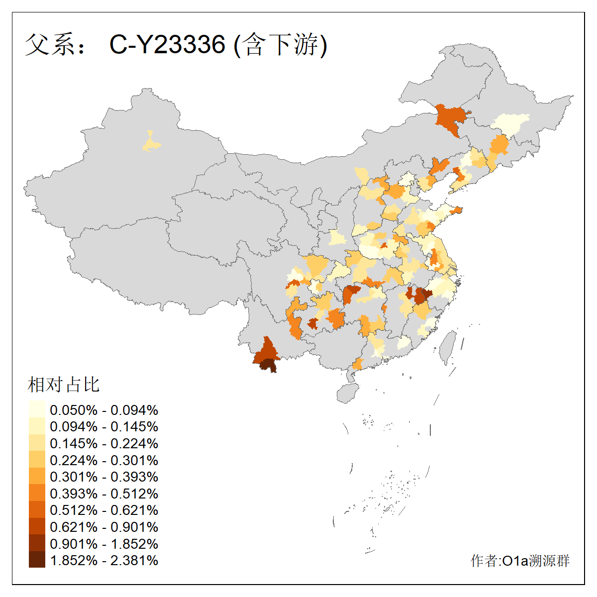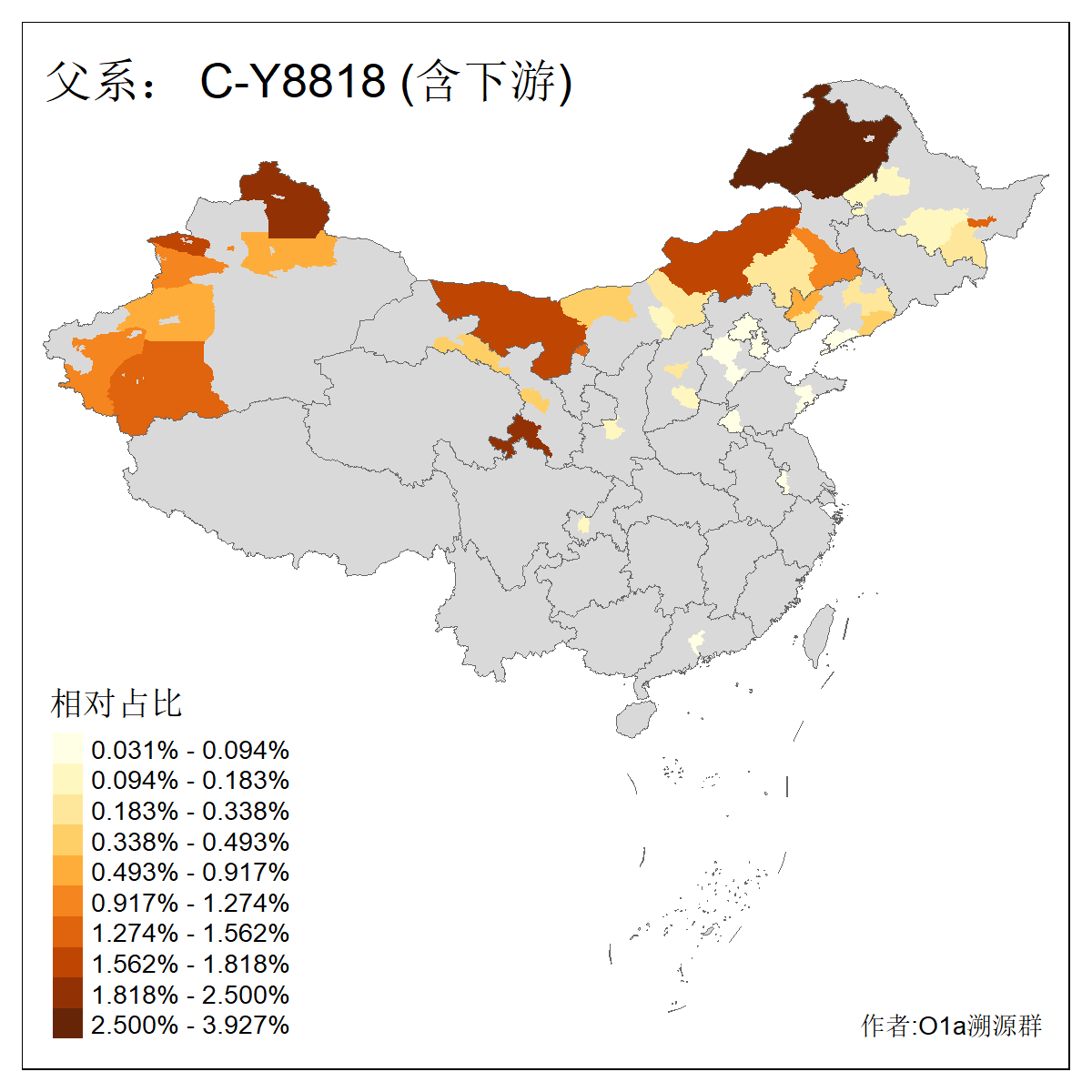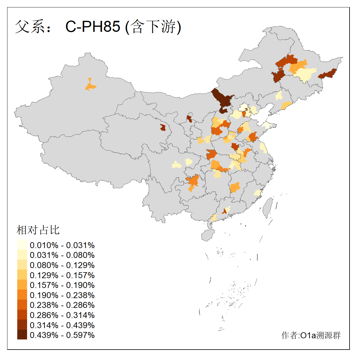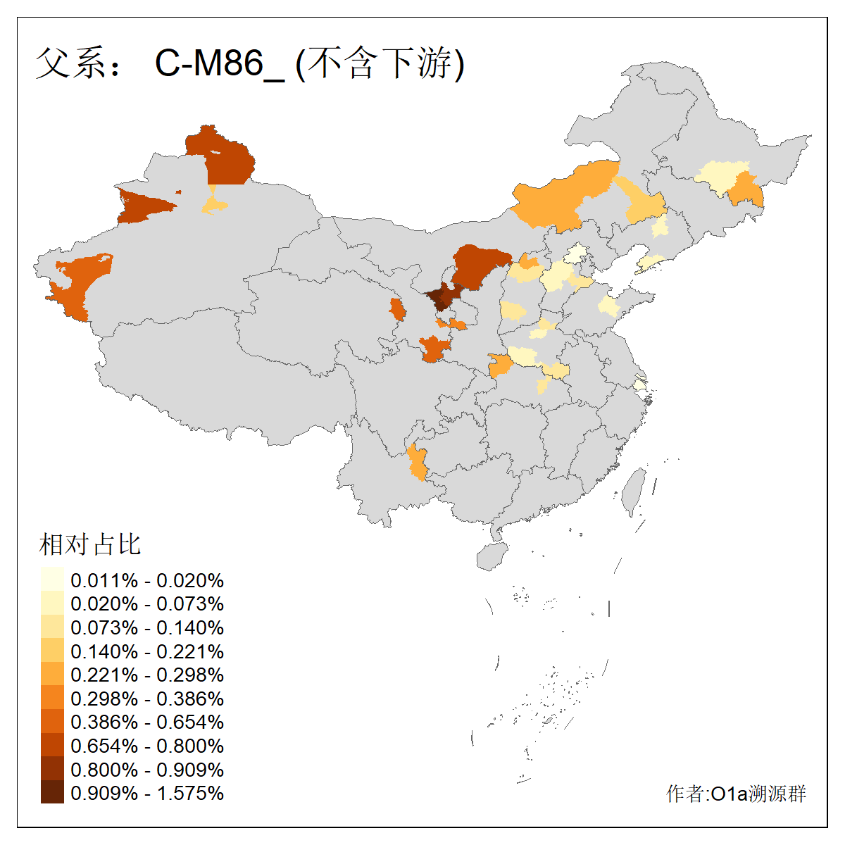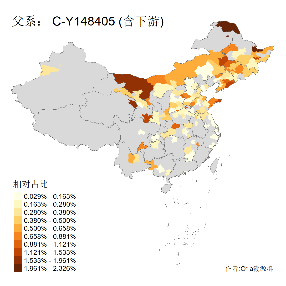| C-M130_C-M217_C-L1373_C-F3447_C-F1699_C-Y6715_C-M48_C-M86_C-SK1061_C-B469 | 2160 | 0.041% | 116人(含下游) 吴:13 白:9 何:5 张:5 包:4 李:4 阿:4 陶:4 付:3 关:3 赵:3 乌:2 卜:2 叶:2 ![]() | 14人(不含下游) 孙:2 白:2 代:1 全:1 凯:1 吴:1 张:1 李:1 赵:1 陈:1 额:1 高:1 ![]() |